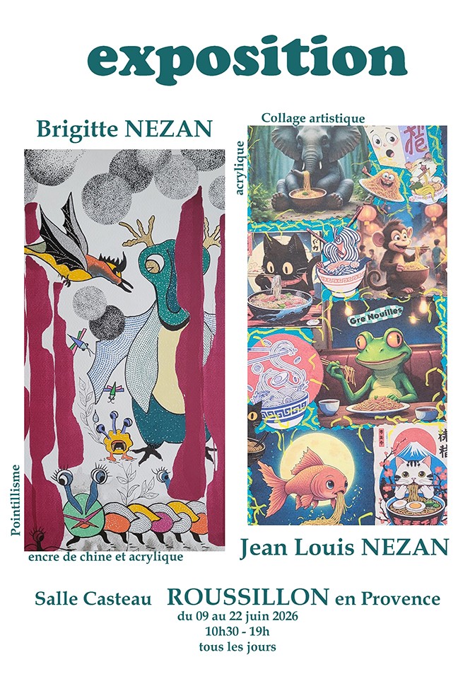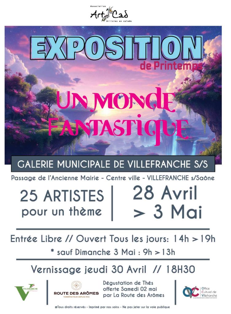 Tous les 2em dimanches de chaque mois. Exposition dans le cadre du collectif Art'Cad au jardin sud de la mairie de Villefranche sur Saône Exposition commune sur le thème "ECLOSION" à la Galerie Municipale de Villefranche sur Saône Salon du livre à Althen les Paluds...