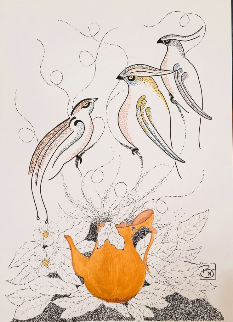 Oui, il fait froid, très froid en ce début d'année et rien de tel qu'une petite tasse de thé et un bon livre pour se réchauffer...... Dessin aquarelle, encre de chine et pointillisme, réalisé en 3D avec peinture sur vitre pour certaines feuilles